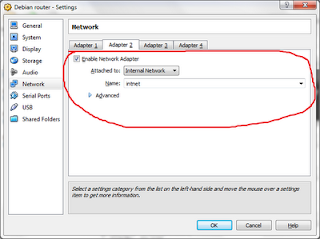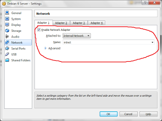 * Name : intnet, agar adapter kedua (eth1) dari mesin VirtualBox Debian router bisa berhubungan dengan adapter Mesin VirualBox Debian Server (Komputer Virtual 2).* Attachted to : Internal Network