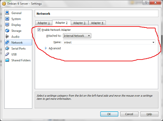 * Name : intnet, agar adapter kedua (eth1) dari mesin VirtualBox Debian Server bisa berhubungan dengan adapter Mesin VirualBox Client Windows XP (Komputer Virtual 3).