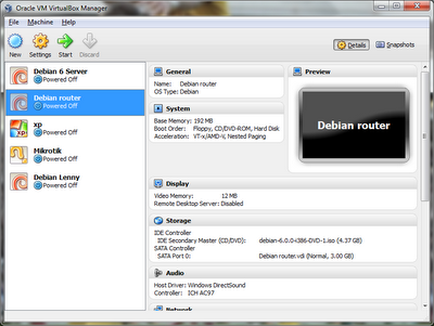 * Pilih Debian Router (Komputer Virtual 1 milik anda), dan pilih pada menu Setting> Network sehingga tampil sbb: