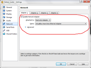* Attachted to : Host-only Adapter * Name : VirtualBox-Host-Only Ethernet Adapter, agar adapter pertama (eth0)dari mesin VirtualBox * Debian router bisa berhubungan dengan adapter VirualBox PC Asli.