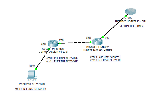 Tujuan dari jaringan diatas adalah Client Windows XP harus dapat mengakses seluruh layanan yang ada di Server Debian maupun layanan Router Debian termasuk koneksi Internet. tapi yang saya akan bahas hanya bagaimana cara setting NIC (Network Interface Card) dalam semua komputer VirtualBox yang berada pada jaringan tersebut.